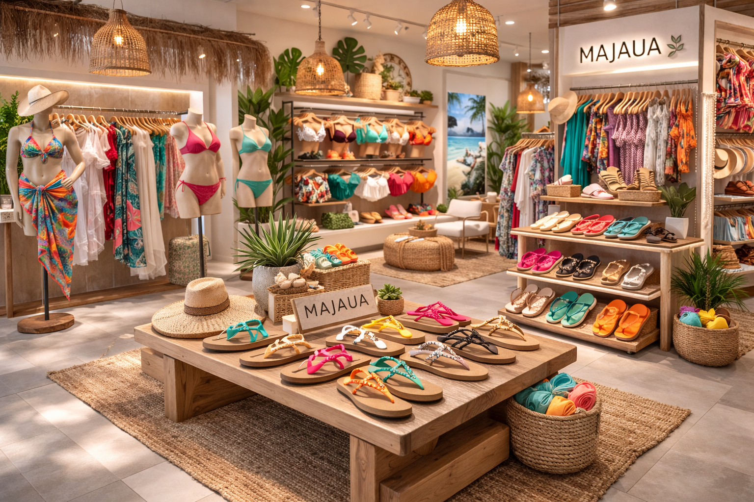Em lojas de swimwear, beachwear e lingerie, a Majaua funciona como um complemento direto às coleções de verão. As sandálias são leves, fáceis de calçar e visualmente impactantes, aumentando o ticket médio e oferecendo ao cliente uma solução completa para praia e férias.